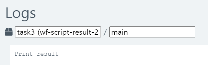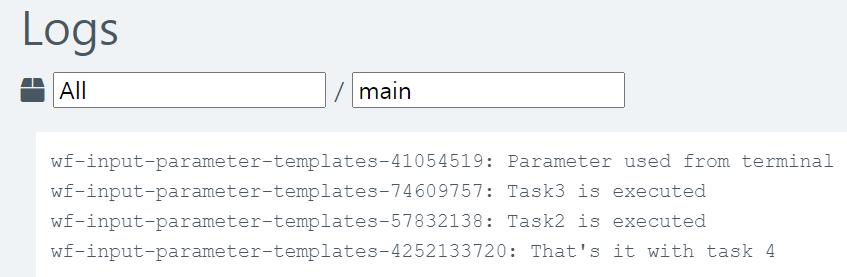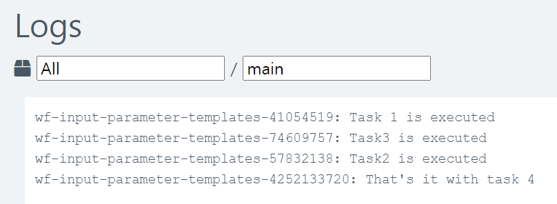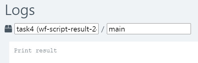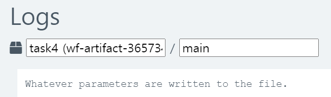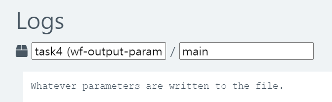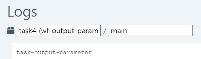 task-output 템플릿 실행시 "/tmp/output-params.txt"라는 파일에 메시지를 출력한다. 그리고 output parameter 'task-param'에 해당 파일로부터 값을 읽어오도록 설정하였다. 위 Workflow를 실행하면 task4의 로그는 다음과 같다.