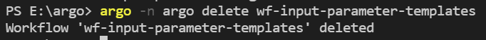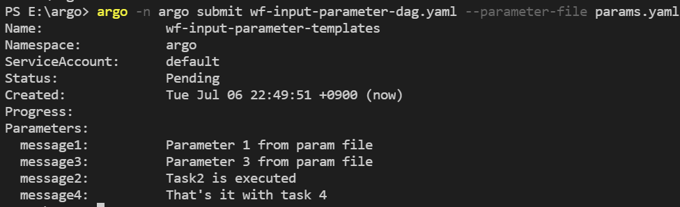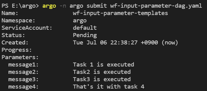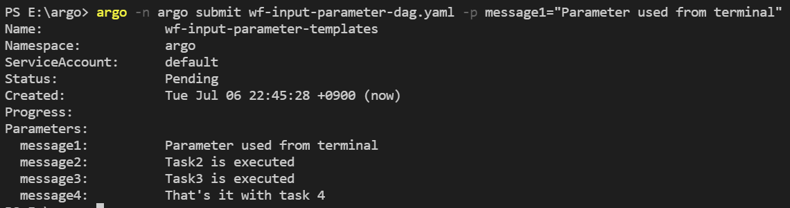 argo -n argo submit wf-input-parameter-dag.yaml -p message1="Parameter used from terminal"