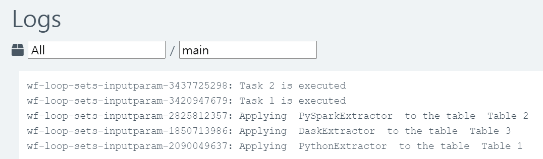 'task-loop-set-template'은 두 개의 Input Parameter 'extractor'와 'table'을 사용하는 Script template이다. 그리고 이를 호출하는 Task3은 Parameter 값을 set으로 전달하는데, 이때 "{{ item.extractor }}"와 같이 Set의 각 필드명을 통해 값을 가져오는 것을 알 수 있다. 다음은 위 Workflow를 실행한 결과이다.