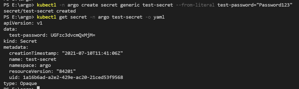 kubectl -n argo create secret generic test-secret --from-literal test-password="Password123"