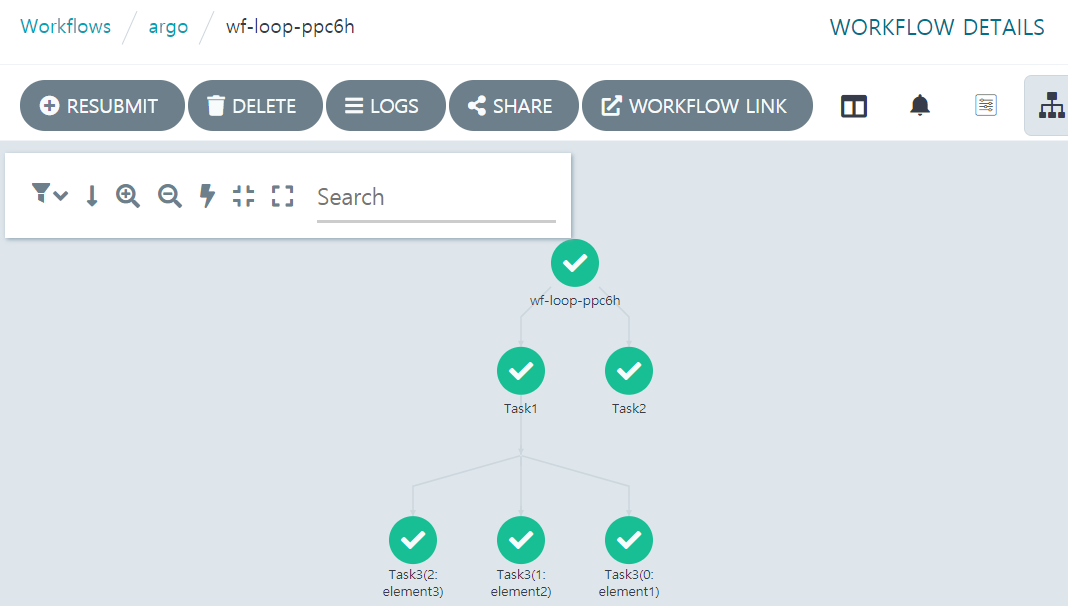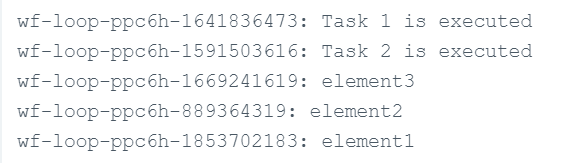 withItems에 Parameter 값을 List 형식으로 나열하고, 템플릿의 parameter 전달시 "{{ item }}"의 Reserve된 이름을 사용하여 반복문 수행이 가능하다. 다만, Loop 방식으로 실행되는 Template은 서로간의 의존성이 존재하지 않기 때문에, 순차 실행이 아닌 병렬 실행이 이루어진다. 다음은 Workflow 실행 결과로 Task3로부터 생성된 Pod은 'element1', 'element2', 'element3'을 각각 출력한다.
