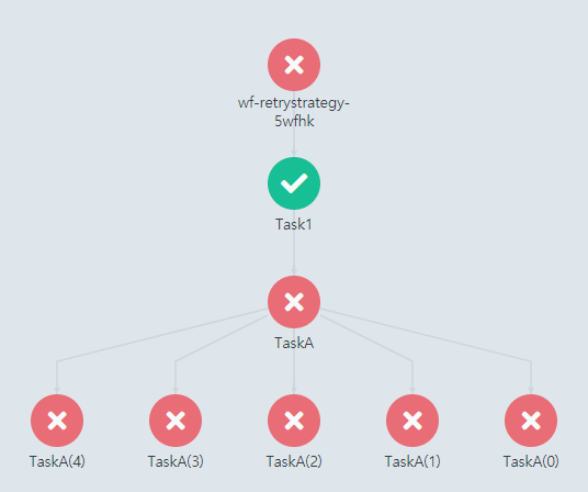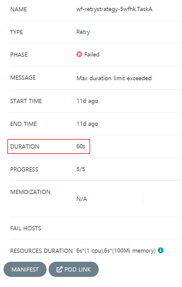 위 Workflow 실행시 아래와 같은 결과를 얻을 수 있다. TaskA의 재시도 5번이 모두 실패하였으며, 60초가 넘어가면서 Workflow도 종료되었다.