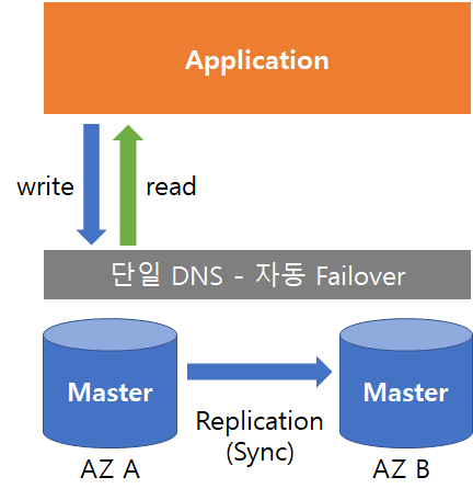RDS Multi AZ는 DR(Disaster Recovery)을 위해 서로 다른 AZ에 2개 이상의 Master DB를 배치하는 것을 의미한다. Read Replica의 주된 목적이 Load Balancing인 것과 달리 보다 높은 가용성을 얻기 위해 사용된다. Active - Standby 방식으로 동작하며, 단일 DNS 이름을 사용하되 장애 발생시 Standby 상태의 Master DB로 접근하는 Failover가 자동으로 이루어진다. 이러한 이유로 기존 어플리케이션에서 따로 수정할 사항은 없다.