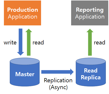 같은 데이터베이스에 대해 하나는 읽기/쓰기 작업이 모두 이루어지는 어플리케이션(ex: Production), 다른 하나는 읽기 작업만 수행하는 어플리케이션(ex: Reporting)이 있다고 가정하자. Production에 미치는 성능적 악영향을 최소화하면서 Reporting을 수행하기 위해선 Read Replica가 가장 최적의 솔루션이라고 할 수 있다.