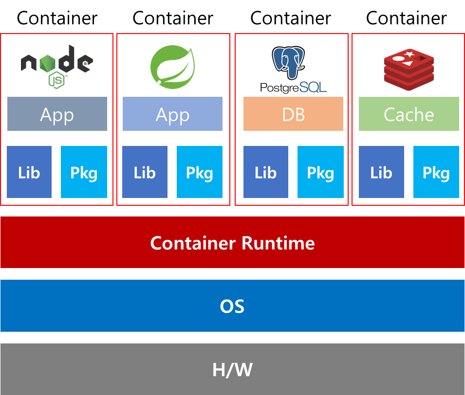 아래 그림과 같이 어플리케이션, 그리고 의존성이 있는 라이브러리와 패키지, 파일 및 환경변수 등을 H/W, OS(정확히는 커널)로부터 격리된 환경에 패키징된 단위를 컨테이너라고 한다. 그리고 컨테이너의 생성, 삭제 등 전체 Lifecycle을 관리해주는 미들웨어가 바로 Docker와 같은 컨테이너 런타임(Container Runtime)이다.