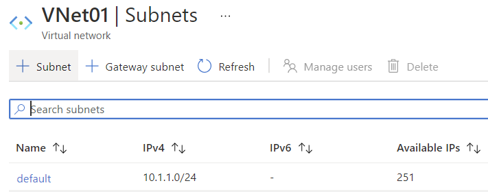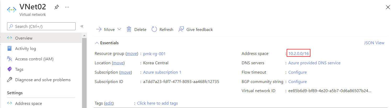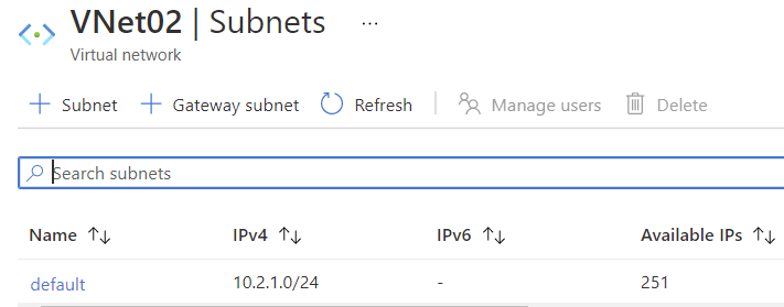 각 VNet에 default라는 이름의 subnet을 추가한 상태이다.