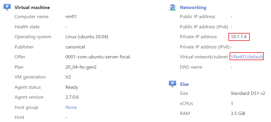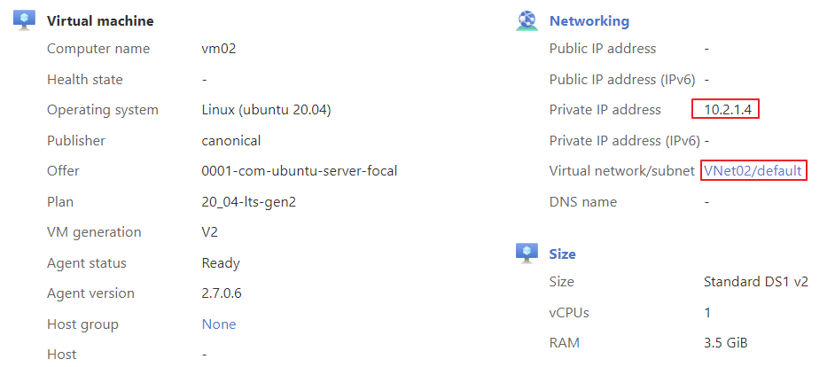 그리고 아래와 같이 각 VNet에 VM 인스턴스를 하나씩 배치하였다. 두 VM 모두 Public IP는 사용하지 않으며, Network Security Group도 기본값을 그대로 사용한다.