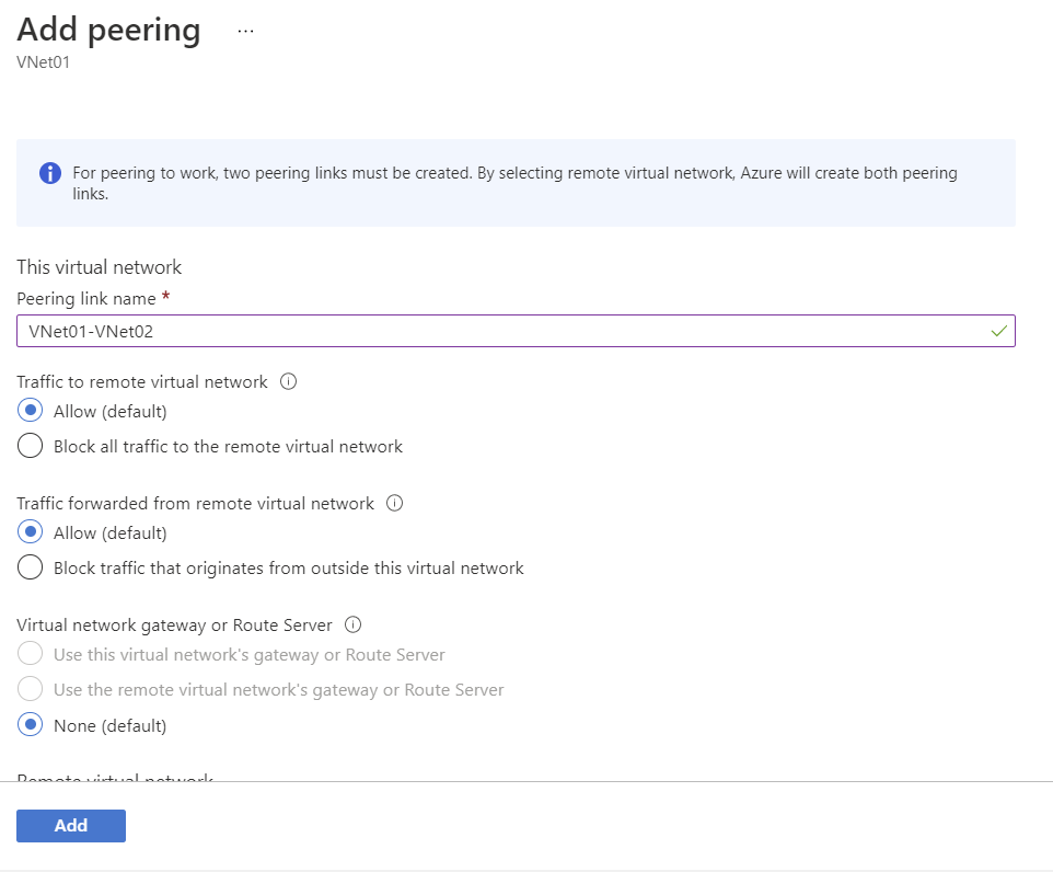 VNet01과 VNet02간의 Peering을 다음과 같이 정의하였다. 설정 자체는 매우 간단하다.
