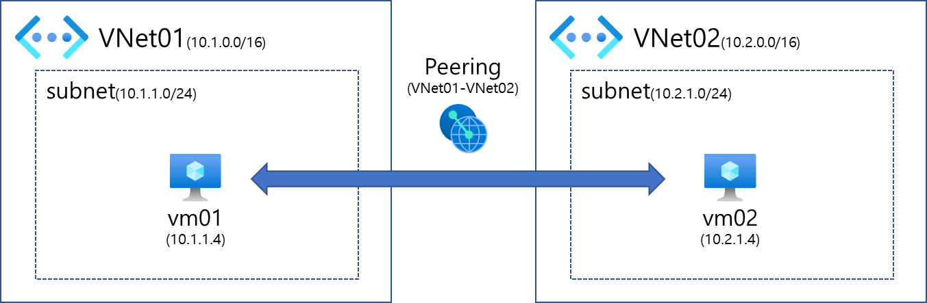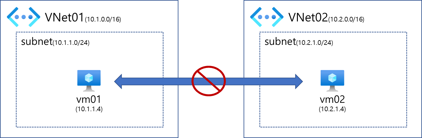 기본적으로 VNet 간에는 서로 다른 네트워크에 위치한 것으로 인식하며, 직접적인 Communication이 이루어지지 않는다. 예를 들어 VNet01(10.1.0.0/16)과 VNet02(10.2.0.0/16)이 있다고 가정하자.