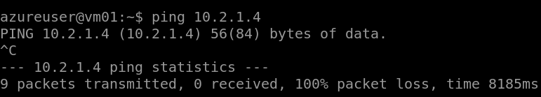 미리 설명했듯 두 VNet은 연결되어 있지 않고 Private IP를 사용하고 있기 때문에, vm01은 10.2.1.4로 가야할 패킷을 어디로 보낼지 모르는 상황이다. 따라서 ping 명령어는 실패할 수 밖에 없다. 그 반대(vm02->vm01)도 마찬가지이다.