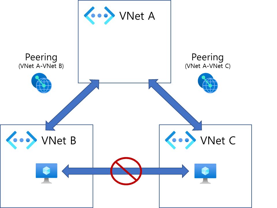 다만 Peering은 다른 VNet에 대해 Trasnsitive하지 않은 성질을 갖고 있다. VNet A와 VNet B, 그리고 VNet A와 VNet C가 서로 Peering 되어 있다고 해서 VNet B와 VNet C간에 네트워크는 성립하지 않는다는 뜻이다.