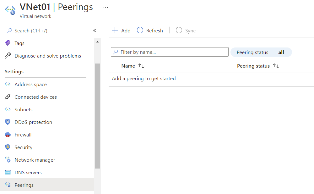 Virtual Network의 Settings 항목 중 Peerings 라는 메뉴를 통해 다른 VNet과의 연결 작업을 진행할 수 있다.