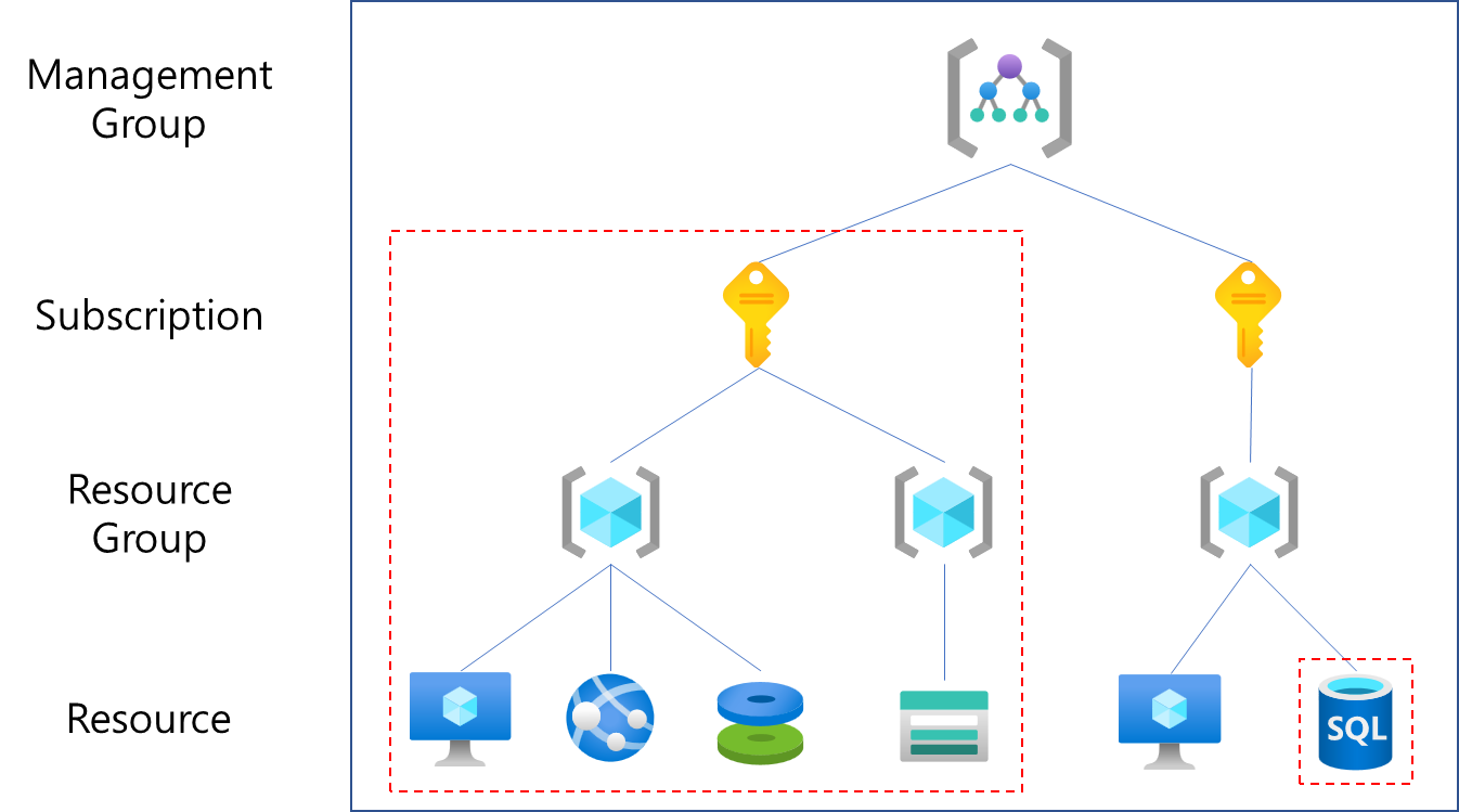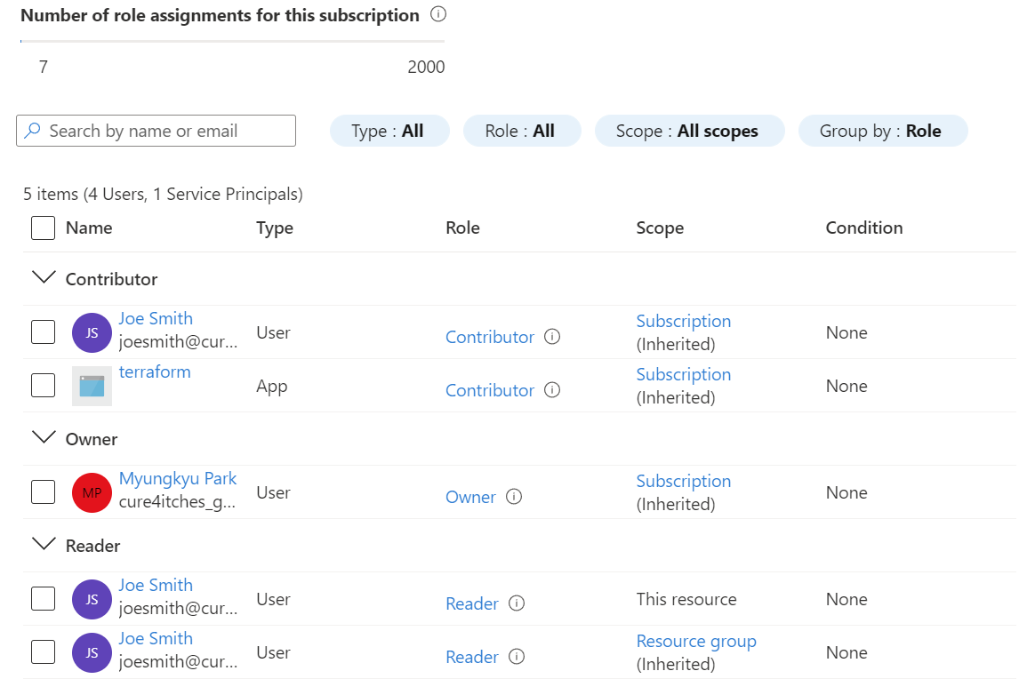 Scope는 Role Assignment가 어디까지 적용되는지에 대한 범위를 뜻한다. Azure의 Resource는 위 그림과 같은 계층구조(Management Group > Subscription > Resource Group > Resource)를 갖는데, 상위 개체에 지정된 Role Assignment는 하위 개체에도 그대로 상속된다. 만약 어떤 Management Group에 Owner Role을 할당받은 User가 있다면 해당 Management Group에 속한 모든 개체에 대해 동일하게 Owner Role을 갖는다. 반대로 특정 Resource(ex: VM 인스턴스)에만 설정된 Role Assignment는 다른 Resource나 상위개체에 적용되지 않는다.