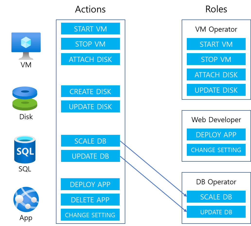 어떤 Security Principal(Identity)에 어떤 Role을 할당하는지에 따라, 해당 Identity가 접근할 수 있는 리소스와 작업이 결정된다. 위 그림처럼 Jane이라는 User에게 Web Developer라는 Role을 할당하면, 해당 User(Jane)은 App Service를 배포하고 설정을 변경할 수 있는 권한을 갖게 된다.