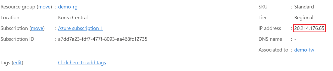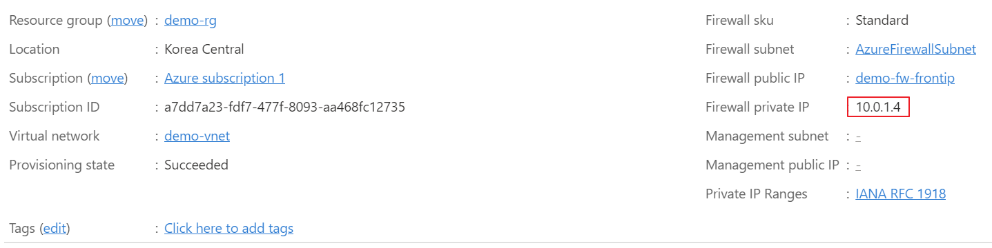 Azure Firewall 생성 후 Public IP와 Private IP를 확인한다.
