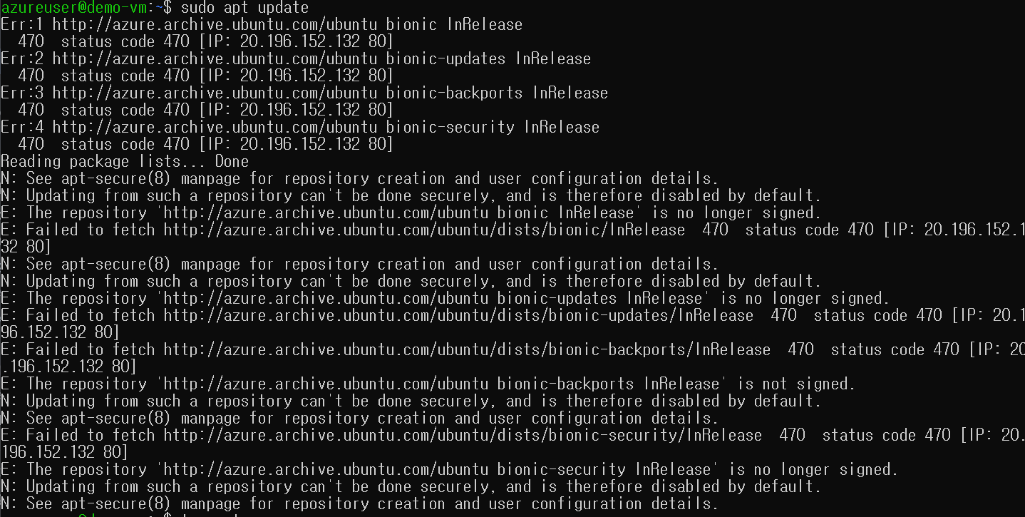 우선 'apt update' 명령어를 실행해보았다. UDR을 통해서 인터넷에 대한 모든 Oubound 트래픽을 Azure Firewall로 가도록 설정하였는데, 기본적으로 인터넷을 향한 모든 Outbound 트래픽이 차단되므로 아래와 같이 실패한다.