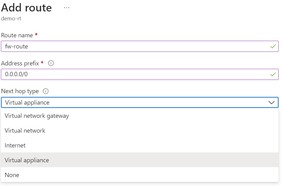 UDR에서 Next hop으로 선택할 수 있는 유형은 다음과 같다.