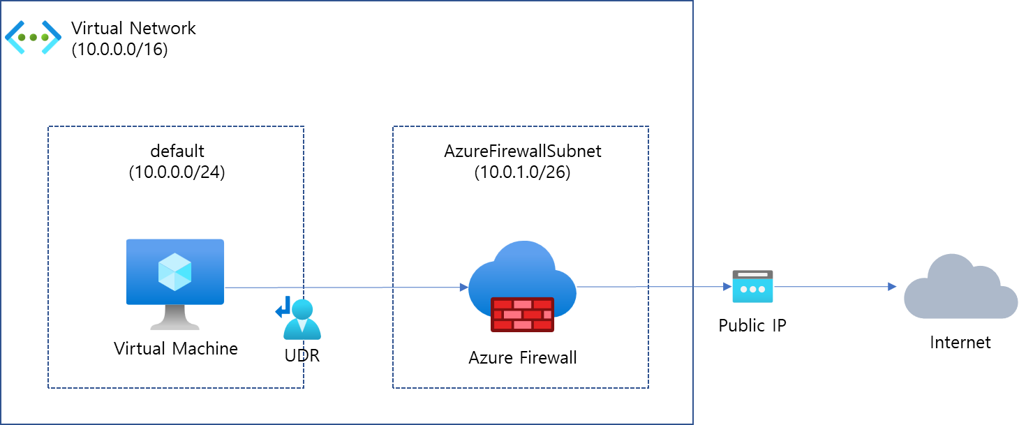 동일한 Virtual Network에 Azure Firewall과 VM을 생성한 뒤, VM에서 발생하는 인터넷 Outbound 트래픽(0.0.0.0/0)을 Azure Firewall로 보내도록 UDR을 설정하는 테스트를 해보자. 아래 그림은 대략적인 리소스 구성을 다이어그램으로 표현한 것이다.
