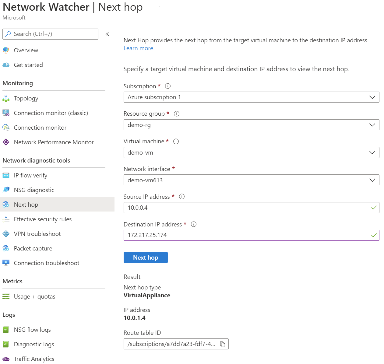 더 확실하게 Next Hop을 확인할 수 있는건 Network Watcher의 'Next hop'을 사용하는 방법이다. 'google.com'의 IP인 '172.217.25.174'로 패킷을 보낼 때, Next hop이 이전에 생성한 Azure Firewall의 Private IP인 10.0.1.4임을 알 수 있다.
