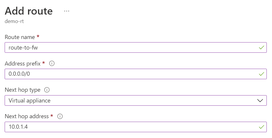 인터넷으로 가야하는 Outbound 트래픽 0.0.0.0/0 을 Azure Firewall로 갈 수 있게 오버라이딩하는 Route를 아래와 같이 정의한다. Next hop type은 Virtual appliance, Next hop address는 Azure Firewall의 Private IP이다.
