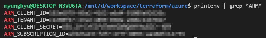 Terraform의 Azure Provider 'azurerm'이 SP의 Credential 값을 자동으로 가져올 수 있도록 환경변수를 추가할 필요가 있다. '~/.bashrc' 파일에 아래 내용을 추가한다.