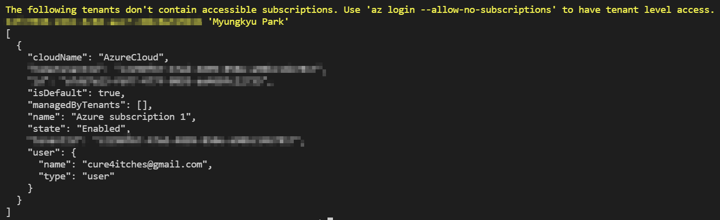 로그인이 완료되면, CLI에서 현재 Subscription 정보가 출력된다. 만약 다른 Subscription에 리소스를 생성한다면 아래 명령어로 Subscription을 변경한다.