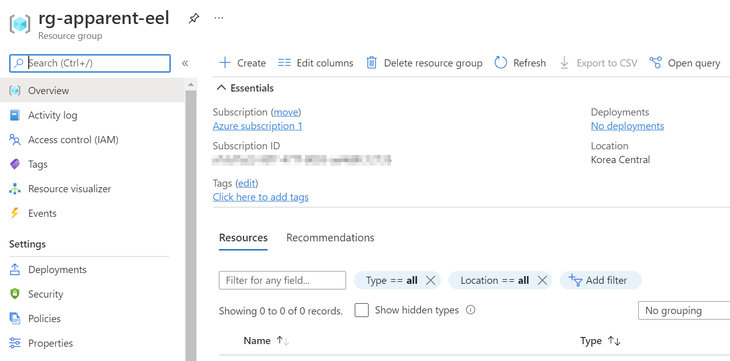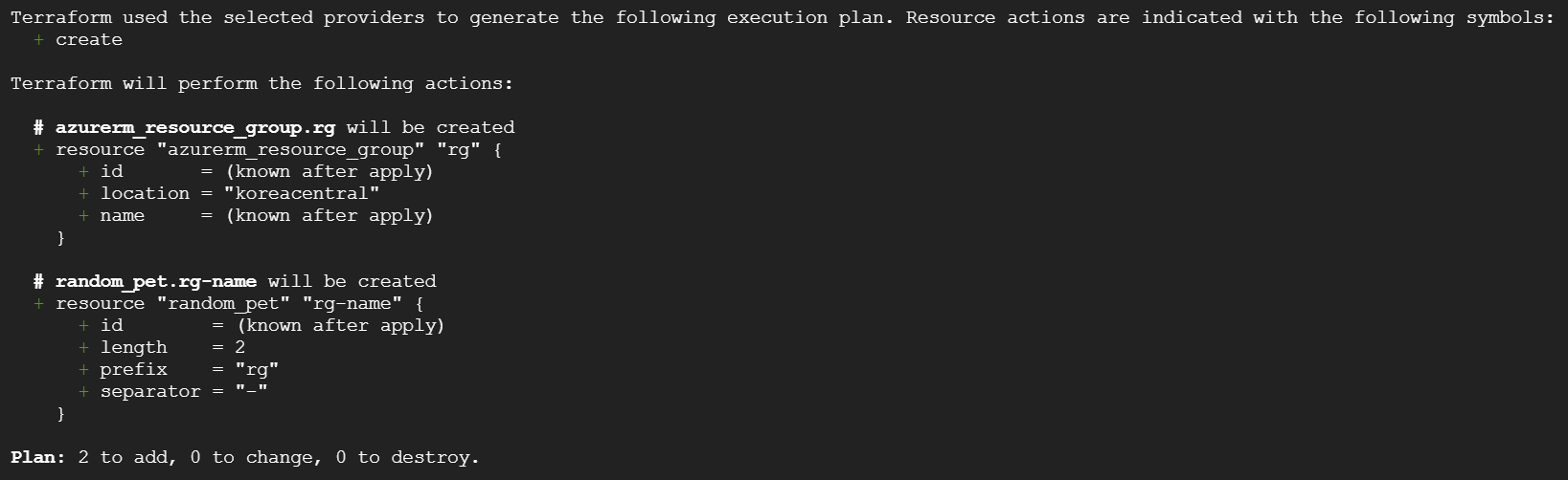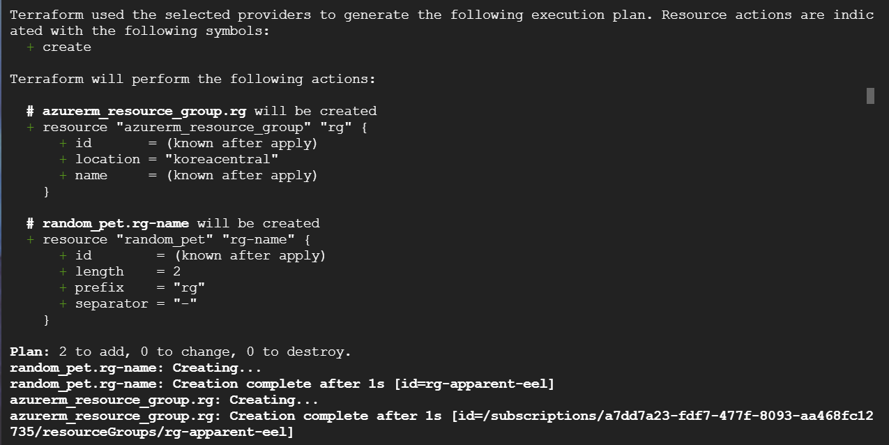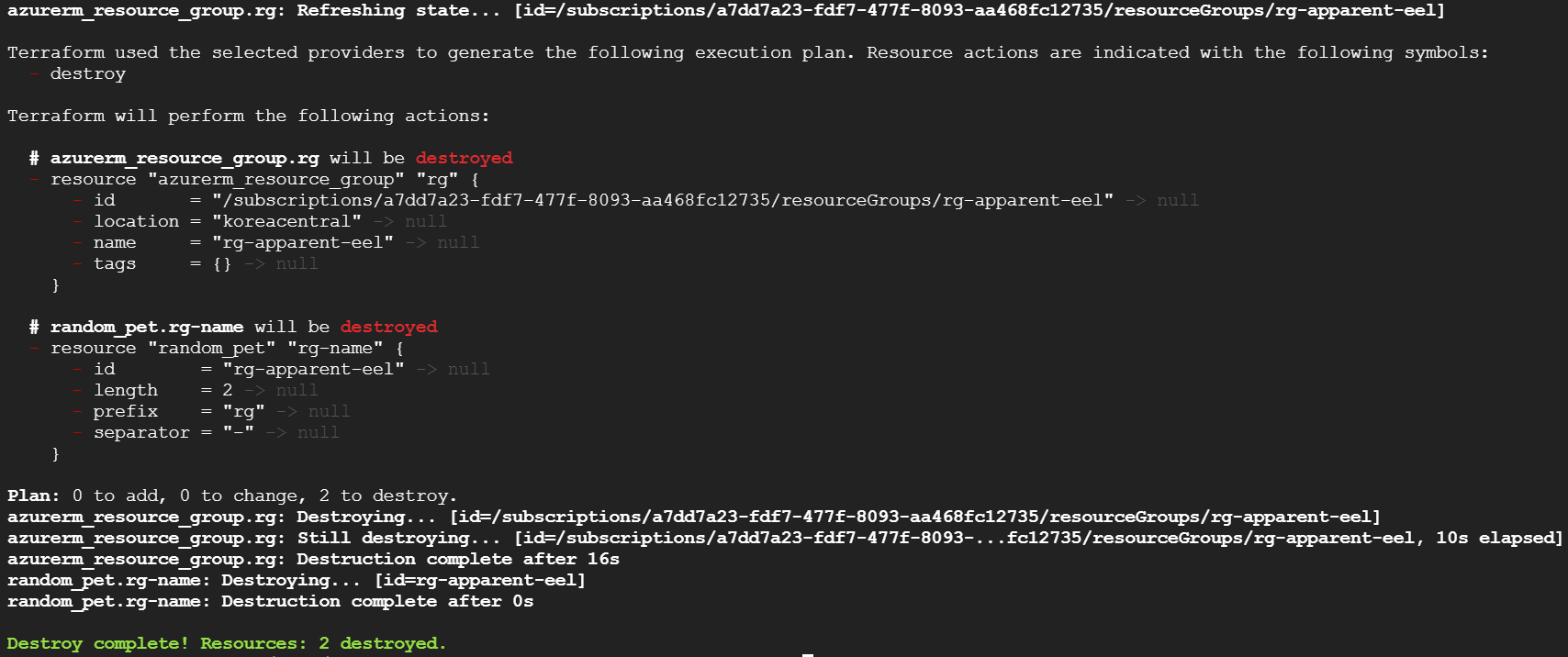 Terraform을 통해 Azure에 Resource Group 'rg-apparent-eel'이 추가되었다. 이제 모든 확인이 끝났으니 다음 명령어로 리소스를 제거한다.