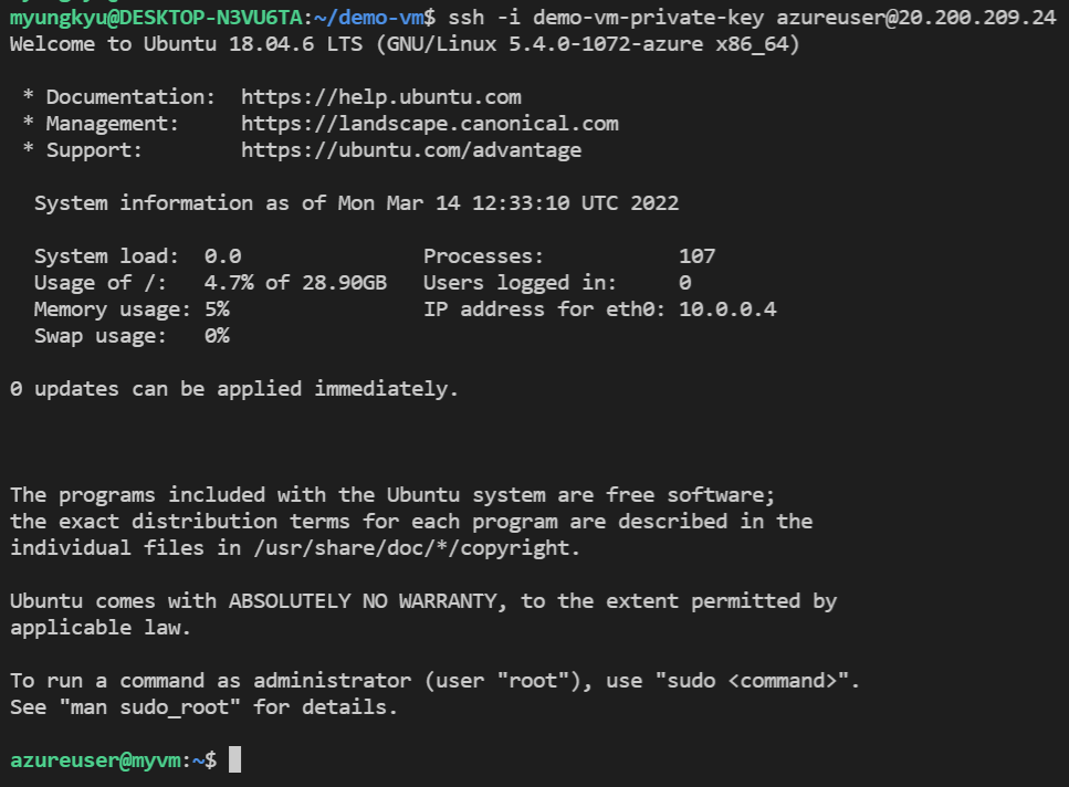 ssh -i demo-vm-private-key azureuser@<public ip addrress>