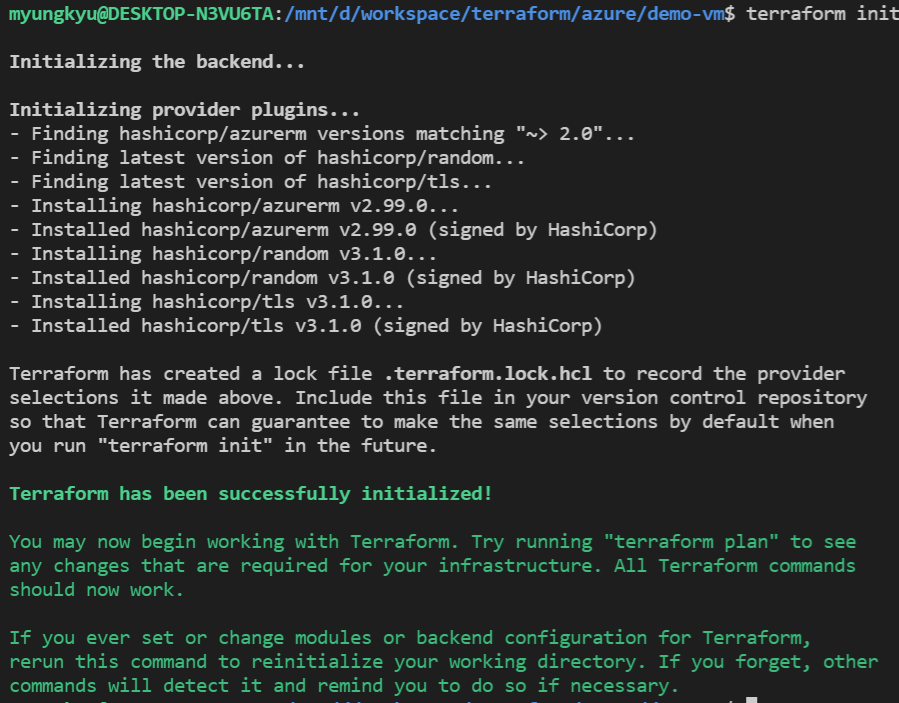 ssh로 VM에 연결이 가능한지 확인한다. VM의 Public IP Address는 'terraform apply' 명령어의 결과로 알 수 있다.