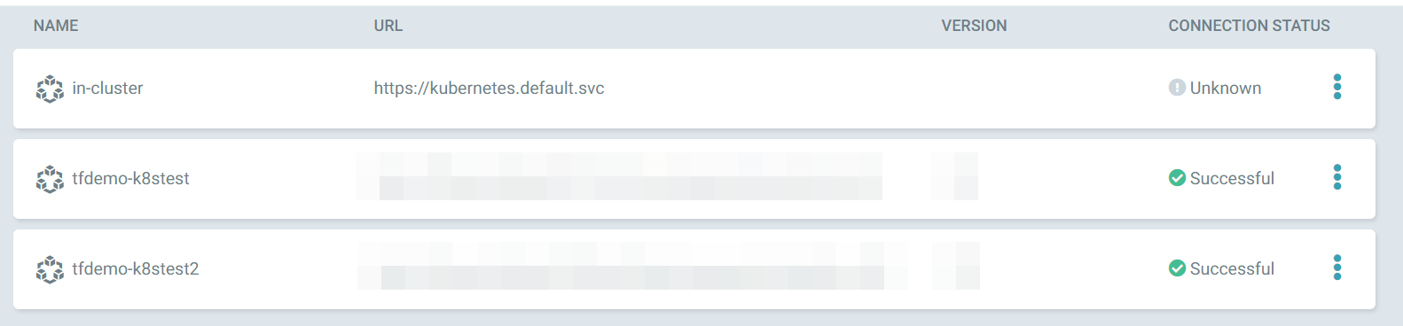 1. 데모용 K8s 클러스터 2개를 준비하였다. 참고로 in-cluster는 현재 Argo CD가 배포된 관리용 클러스터이며, 여기엔 배포하진 않고 'tfdemo-k8stest', 'tfdemo-k8stest2' 클러스터에 Application을 배포할 계획이다(URL은 보안상 모자이크 처리).