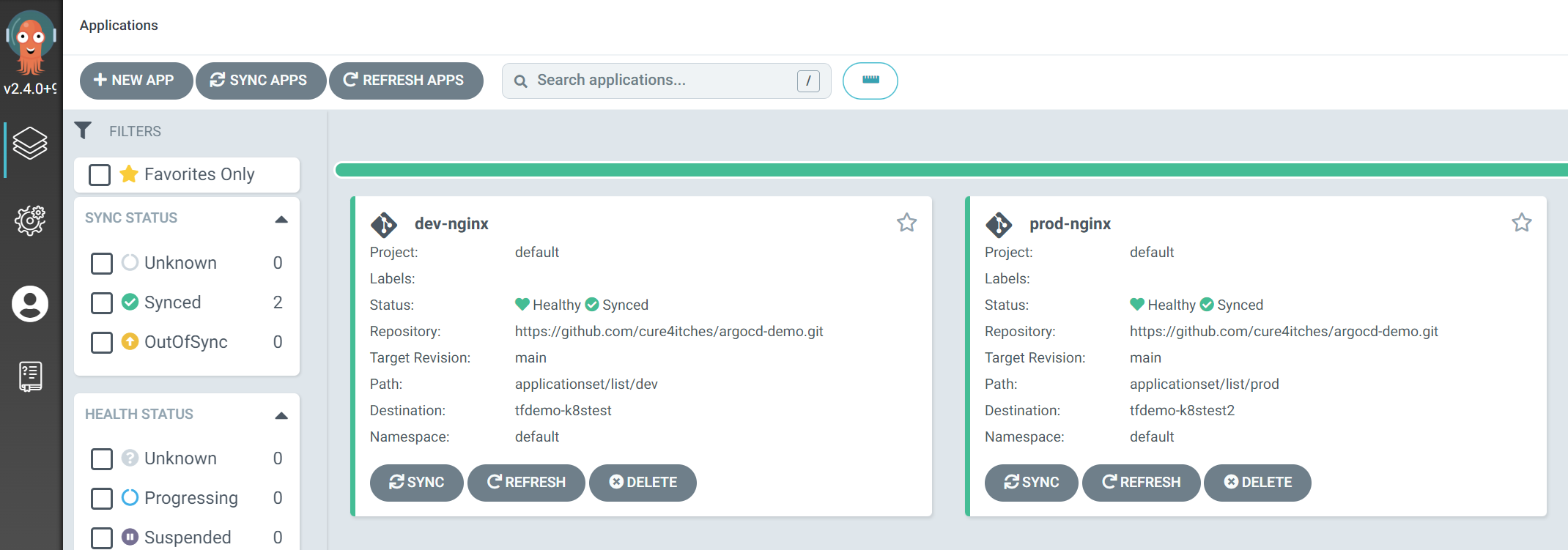 6. Argo CD 웹 콘솔에 접속해서, Application 2개가 추가되었는지 확인해보자.
